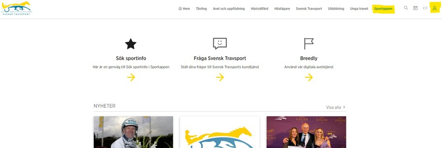 Såväl knappen "hem" som logotypen i vänster hörn leder tillbaka till Sportappens startsida. Vill du tillbaka till travsport.se använder du länken "travsport.se" i menyn.