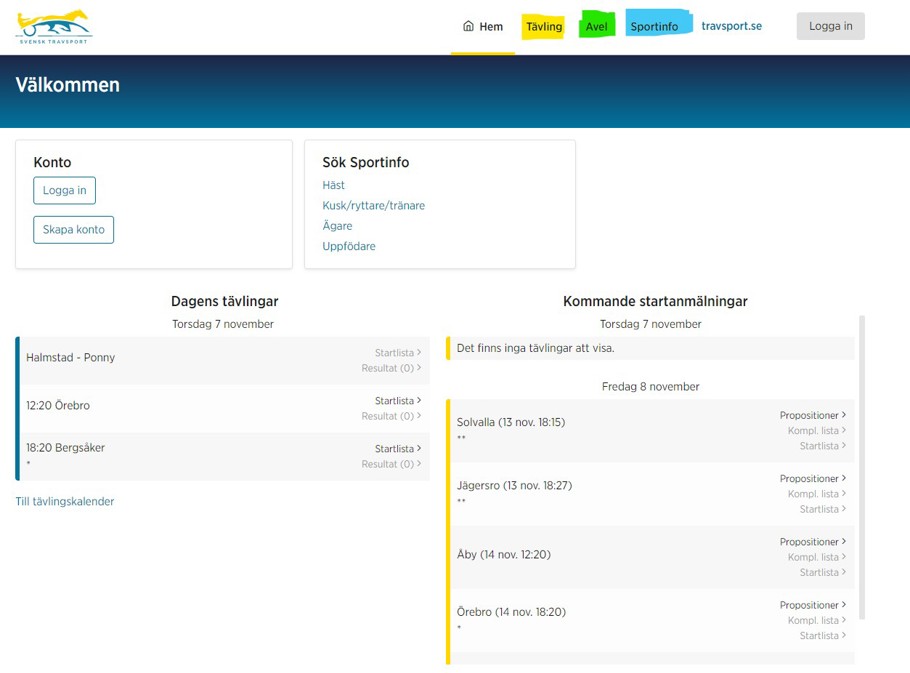 När du är inloggad på ditt användarkonto utökas menyerna med dina funktioner baserad på vem du är (tränare, kusk, hästägare, etc). Här kan du göra de saker du kunde på den tidigare hemsidan också, anmäla hästar, sätta upp dig som kusk, hantera TDS:en, osv.
