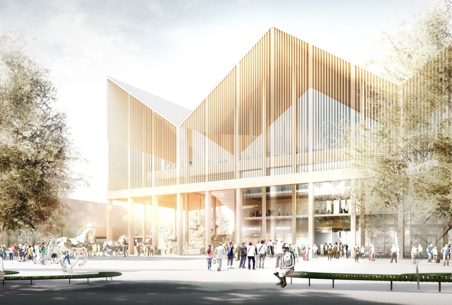 Om entrén verkligen blir som på bilden är ännu inte beslutat, men här är den tilltalande tanken att ta upp delar av banans logotyp i byggnadens uttryck: kronan över J:et i Jägersro.
