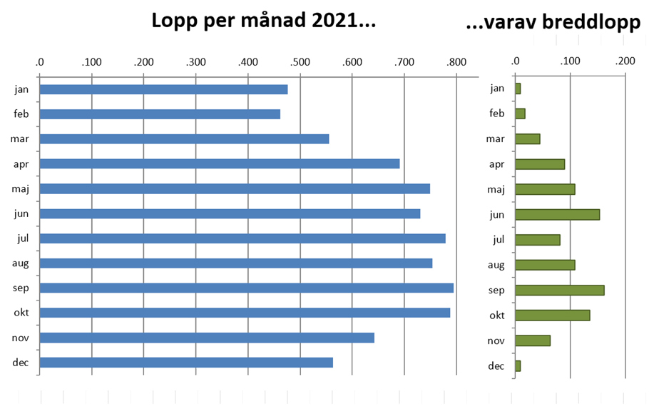 Budgetbesluten är inte klubbade ännu, men just nu räknar vi med att köra ca 8 300 lopp 2021, vilket är ungefär 100 lopp fler än vi körde i år. Som vanligt finns det flest lopp på sommaren och hösten när flest hästar är startklara. Så här fördelar sig tävlingstillfällena nästa år.