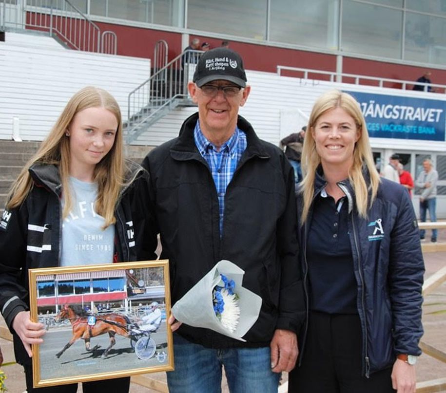 Bilden: Frida Johannson och Gunnar Kylén uppvaktas av Johanna Karlin från Årjängstravet efter att de varit månadens hästare i maj ifjol (Frida och hennes pappa Lars-Åke Johansson blev i år månadens hästägare i Årjäng för augusti, efter Stjärnvikings framgångar).