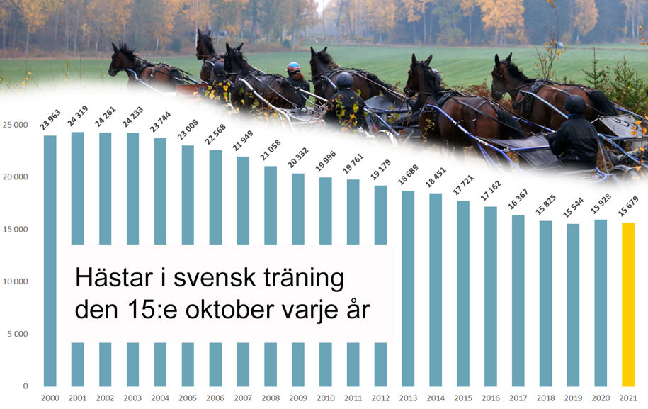 Siffrorna för antalet häst i träning har visat en sjunkande trend sedan 1990-talet men där ser det ändå ganska stabilt ut de senaste fyra åren. De svenska tränarna har sedan 2018 haft strax under 16 000 varm- och kallblod på sina träningslistor i mitten av oktober, så även i år.