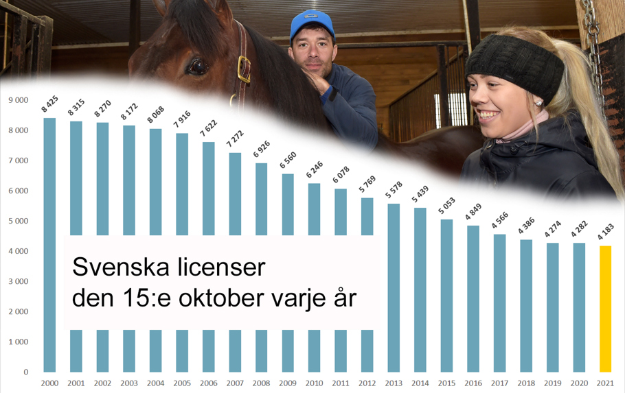 I mitten av 1990-talet hade svensk travsport sin absoluta guldålder med över 10 000 registrerade tränings- och körlicenser. Sedan dess har antalet licenser sjunkit med några hundra per år, bortsett från ifjol då det faktiskt var en liten ökning. Jämfört med samma tid ifjol har licenssiffran sjunkit med två procent, och det är B-licenserna som står för minskningen.