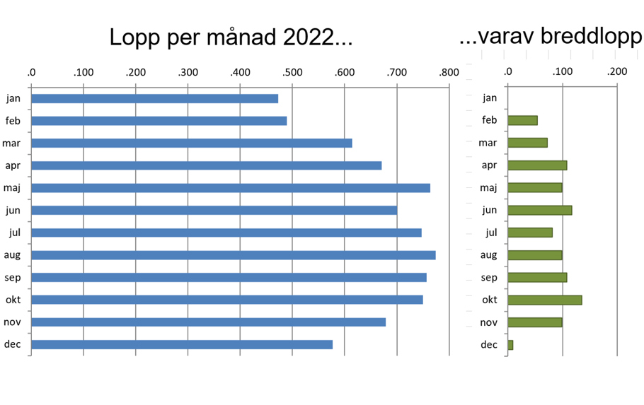 Tävlingsvolymen 2022 är väldigt lika 2021 och det rimmar med att antalet hästar i svensk träning är ungefär lika många som de senaste två-tre åren. Fördelningen av antalet tävlingar mellan banorna är också nästan samma som 2021, det är bara några enstaka breddloppsdagar som flyttats mellan banorna.