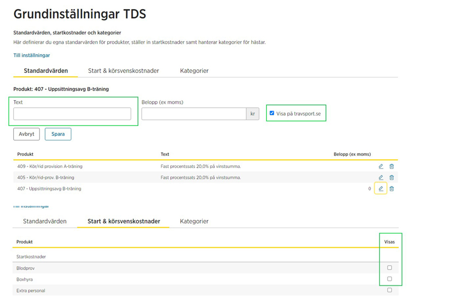 För att uppsittningsavgiften och provisionen ska synas måste ett värde sparas för produkten under TDS Grundinställningar fliken Standardvärden. Du väljer om avgiften ska synas genom att klicka i rutan ”Visa på travsport.se” för varje relaterad produkt. Liksom tidigare avser textfältet under produkterna uppsittningsavgift endast den text som visas i TDS. Den texten kommer inte att synas på travsport.se