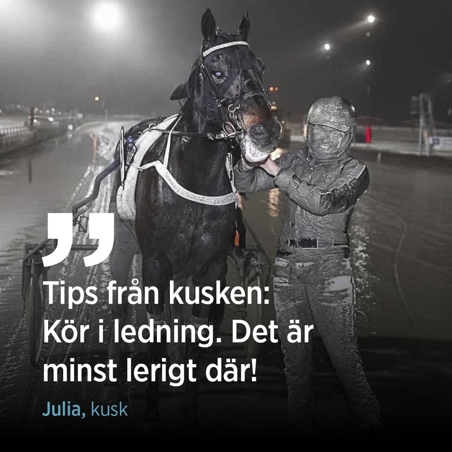 För hästen Sjaman, som ägs av Jennie tillsammans med sin sambo Jonas Hallstenson och som vid tillfället kördes till seger på Färjestadstravet av Julia blev det alltså en av årets och kanske karriärens (?) skitigaste dagar.