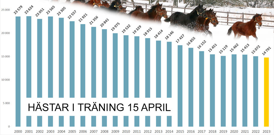 Siffrorna för antalet häst i träning har visat en sjunkande trend sedan 1990-talet även om utvecklingen stabiliserats något de senaste fem åren. De svenska tränarna har sedan 2019 haft runt 15 000 varm- och kallblod på sina träningslistor i mitten av april. I år sjunker siffran något, cirka två procent.