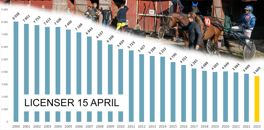 Jämfört med samma tid ifjol har licenssiffran sjunkit med nästan fem procent. I mitten av 1990-talet hade svensk travsport sin absoluta guldålder med över 10 000 registrerade tränings- och körlicenser. Sedan dess har antalet licenser sjunkit med några hundra per år, bortsett från 2020 då det faktiskt var en liten ökning.