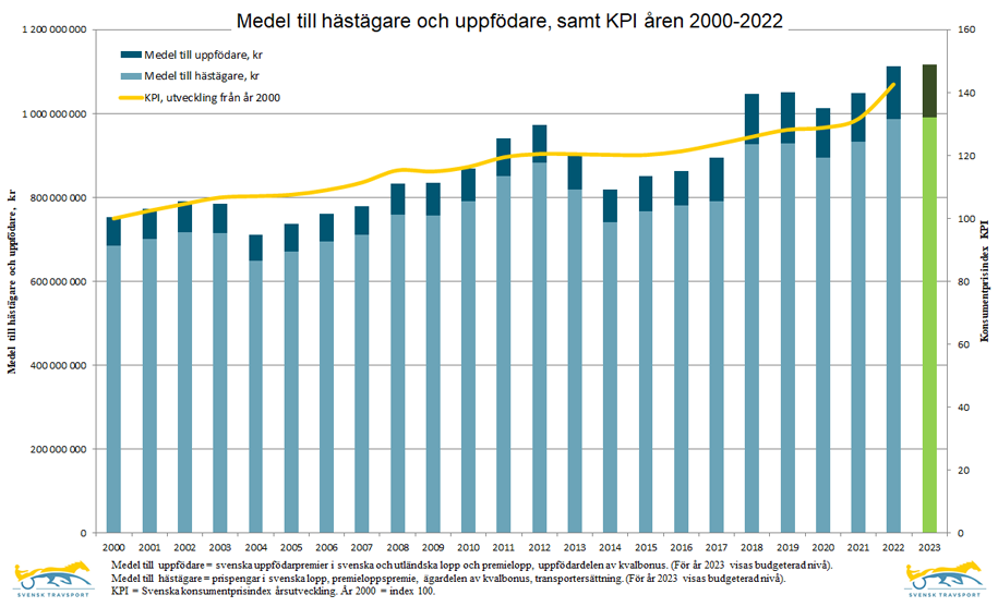 De blå staplarna visar hur mycket pengar som betalats ut till hästägare (ljusblå) och uppfödare (mörkblå) i Sverige under åren 2000-2022, samt hur mycket som är budgeterat för 2023 (grön stapel).